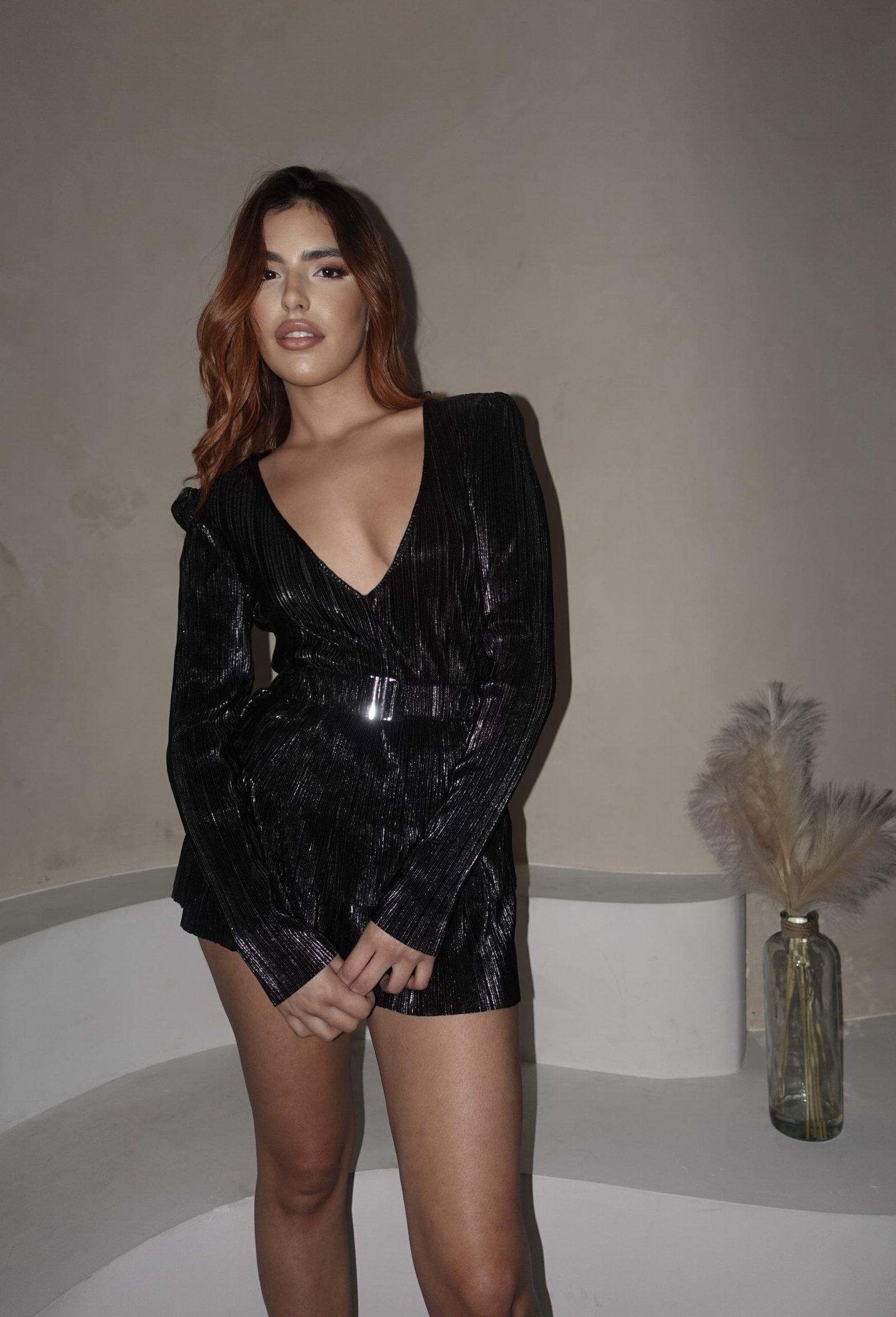 Metallic Foil Plisse Belted Tiered Mini Dress