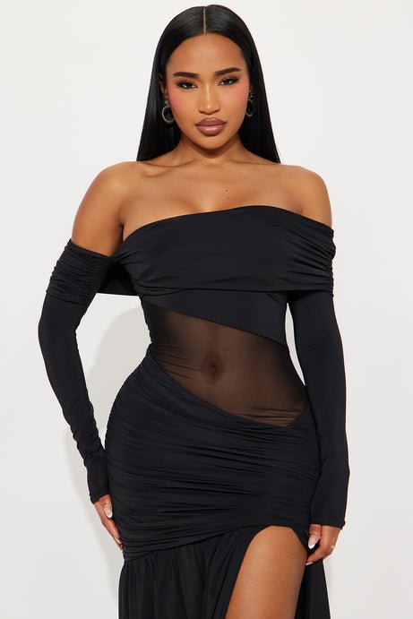 Velora Asymmetrical Long Sleeve Maxi Dress – Black