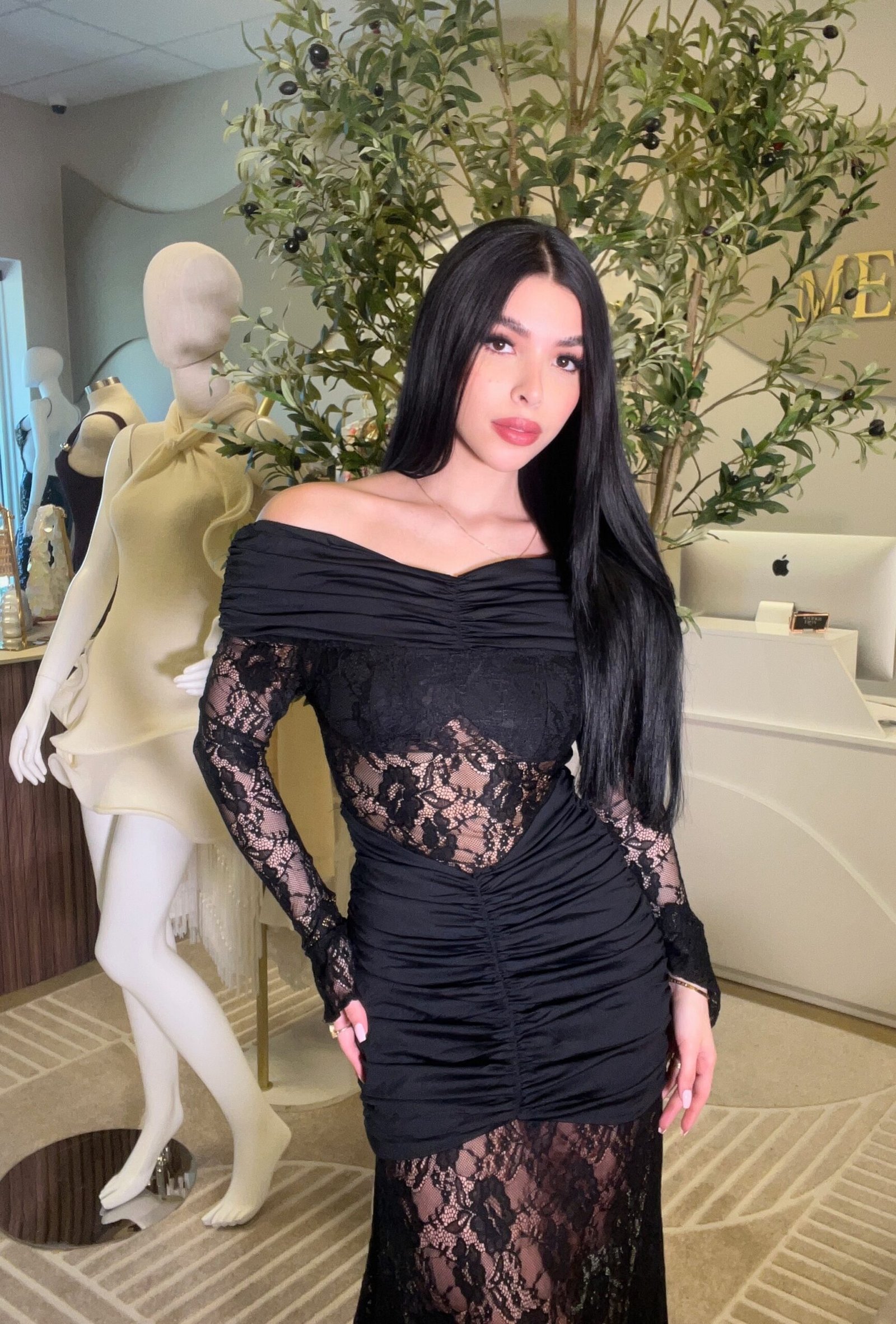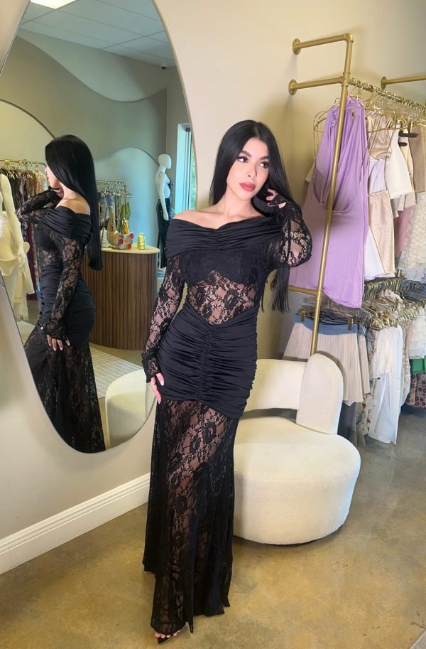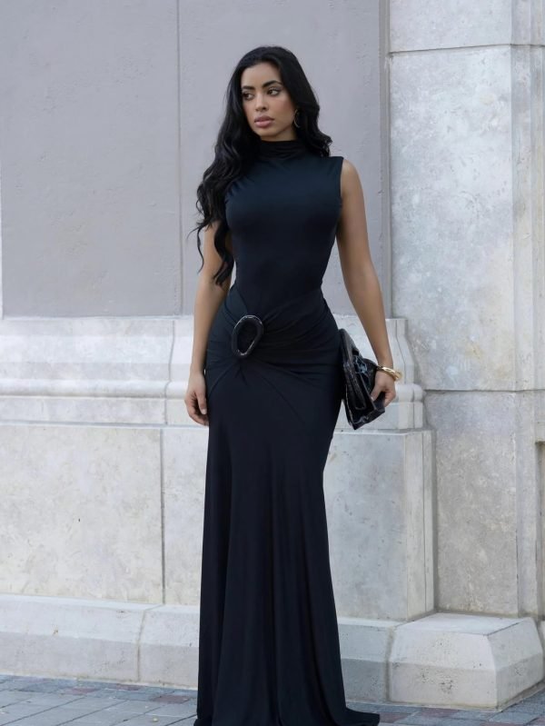Velora Asymmetrical Long Sleeve Maxi Dress – Black