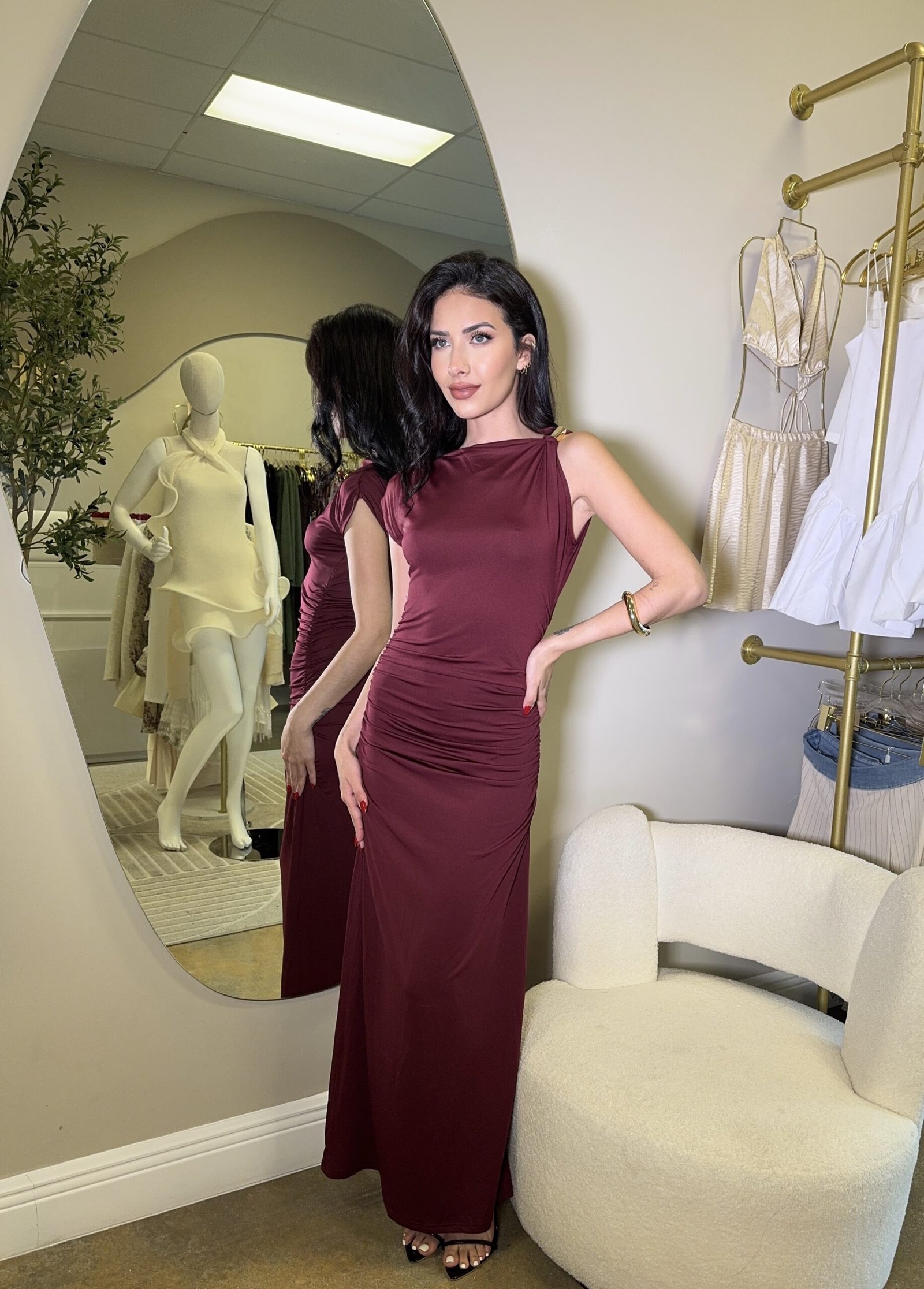 Ruched Midi Dress with Metal Ring Strap Detail
