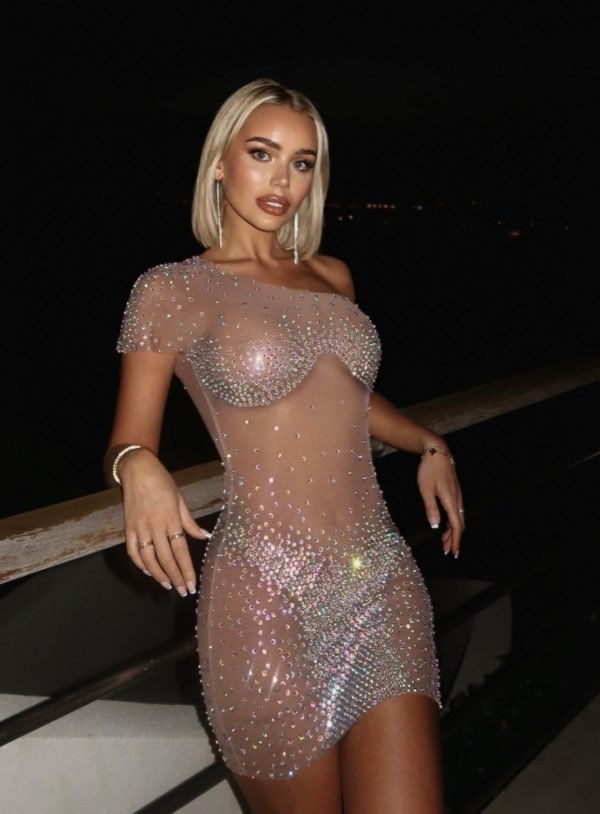 Sheer Mini Dress with Crystals and Off the Shoulder Design