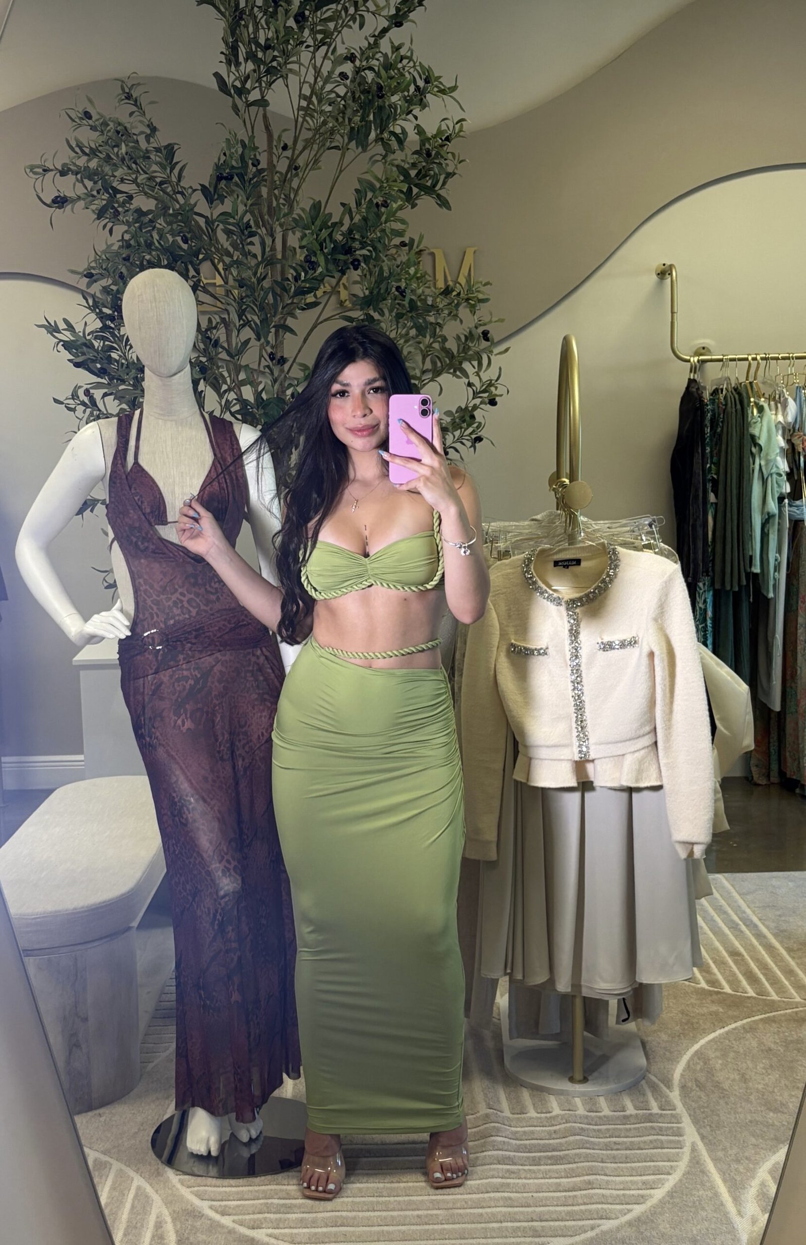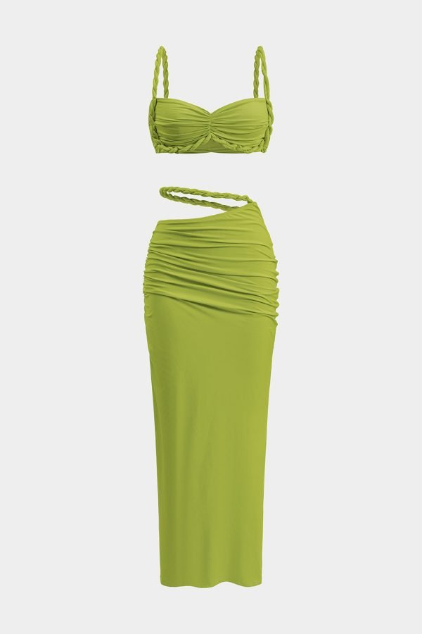 Two-Piece Set Top And Skirt With Side Slit And Drawstring – Green